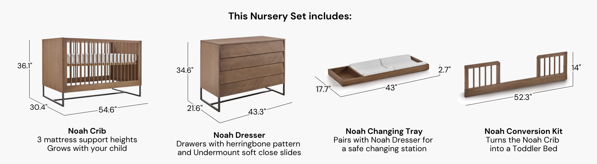 The furniture looks great! We love the finish of the wood and the style of the furniture. The dresser was a task to build but it looks great!