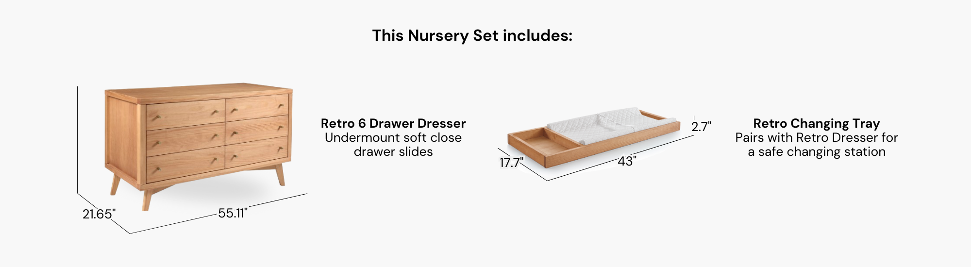 Retro 3 Dresser in Walnut Undermount Soft-Close Drawer Slides 21.6" 43.3" 33"