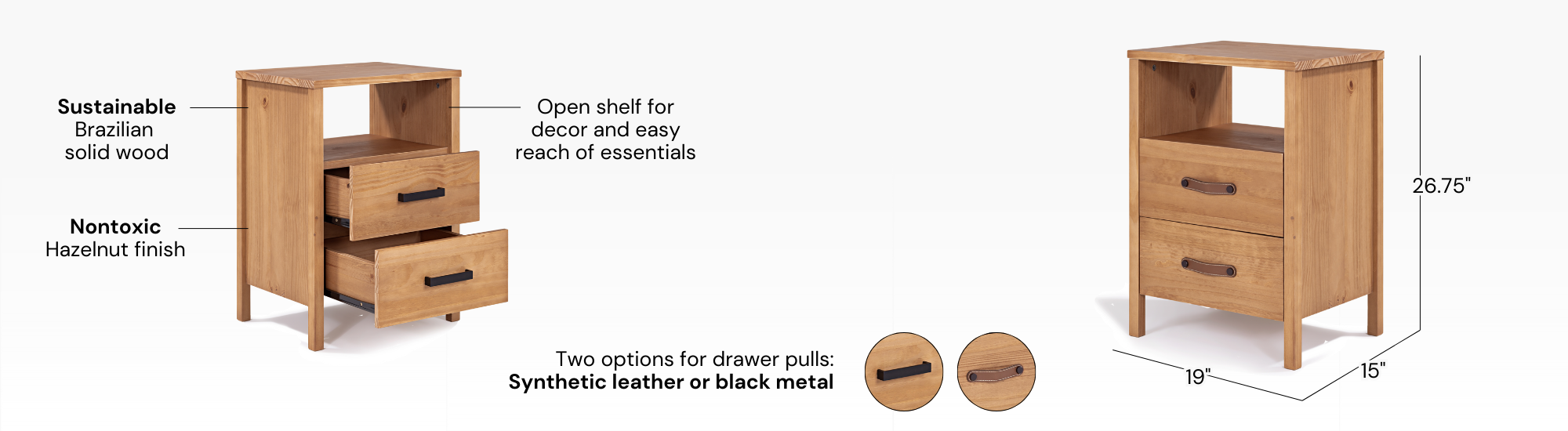 We love this nightstand as an addition to our nursery and a long-lasting piece for our child’s room. Assembly was rather easy, but the handles did unfortunately [too] easily mar the front of one of the drawers. Still, we would highly recommend as an addition to a nursery!