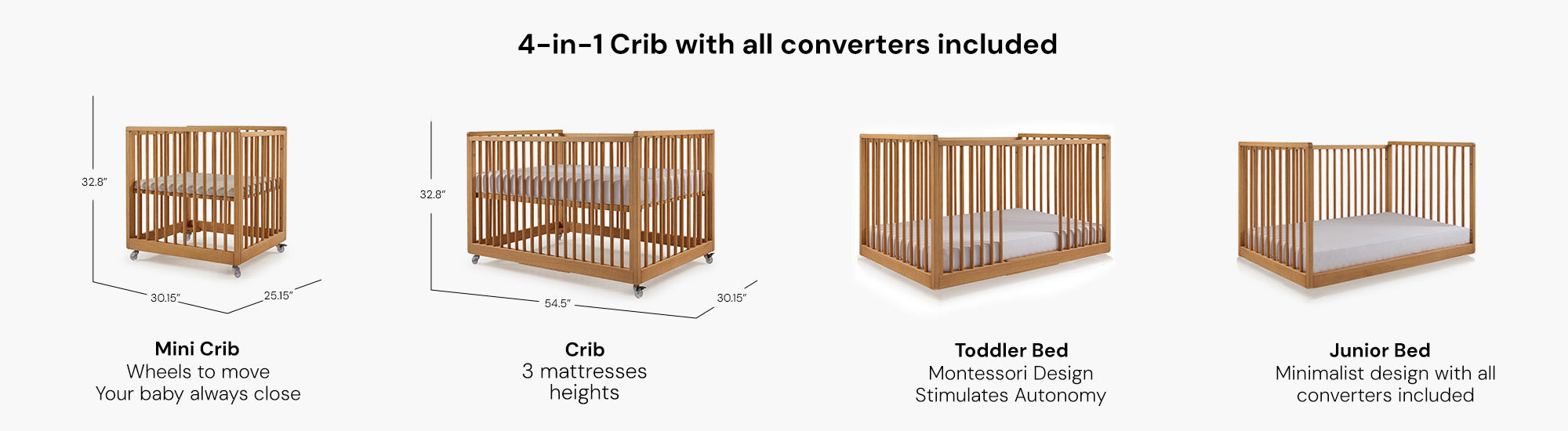 - Convertibility: 4-in-1 (Mini Crib, Full-Size Crib, 2 Toddler Bed Options) with all converters included.