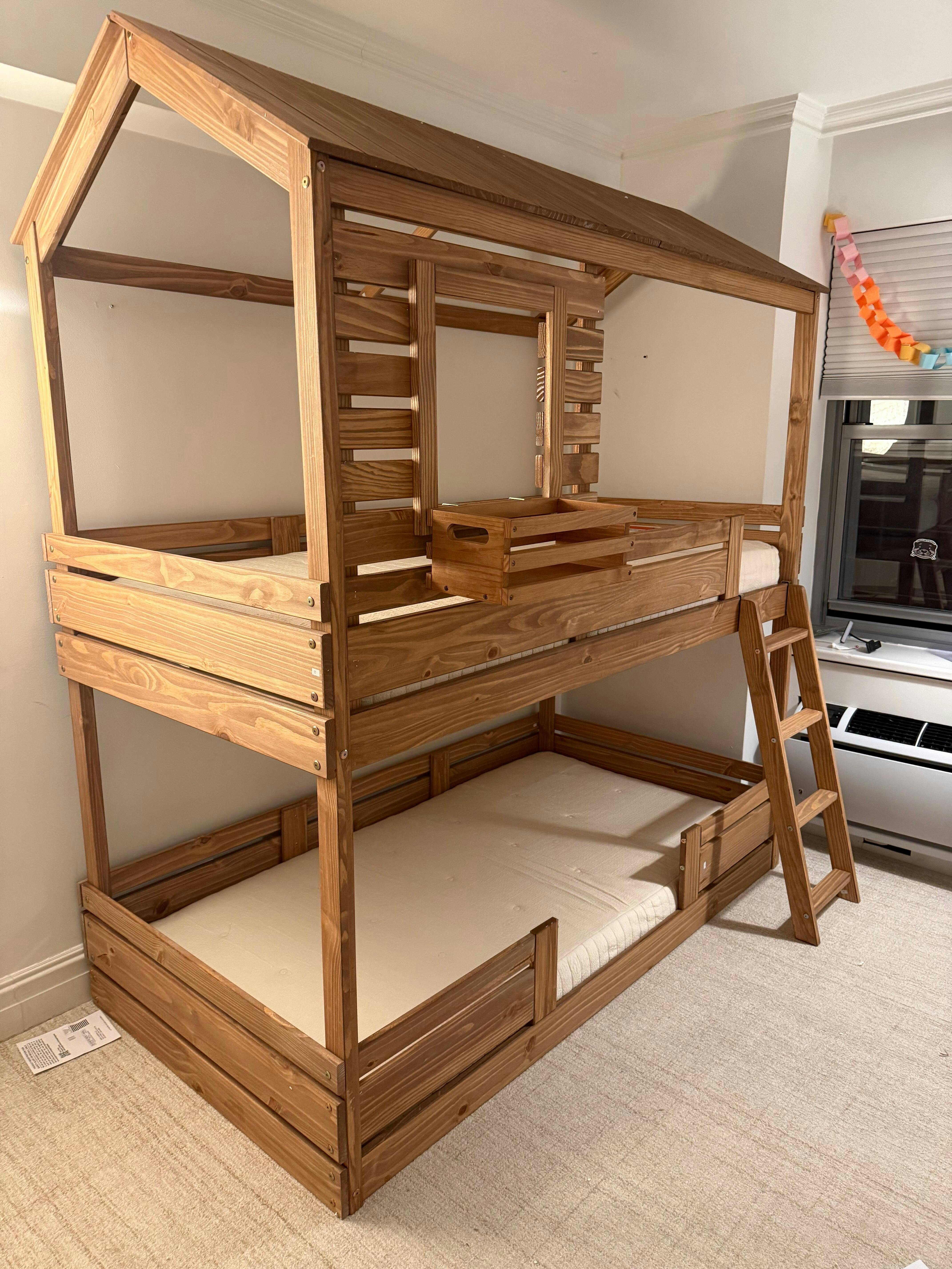 Nicole We just had the bunk bed built (we hired someone to build it and it took them about 3 hours). It looks great. We ordered 2 baskets for the top and bottom bunk. Still need to get the mattresses.